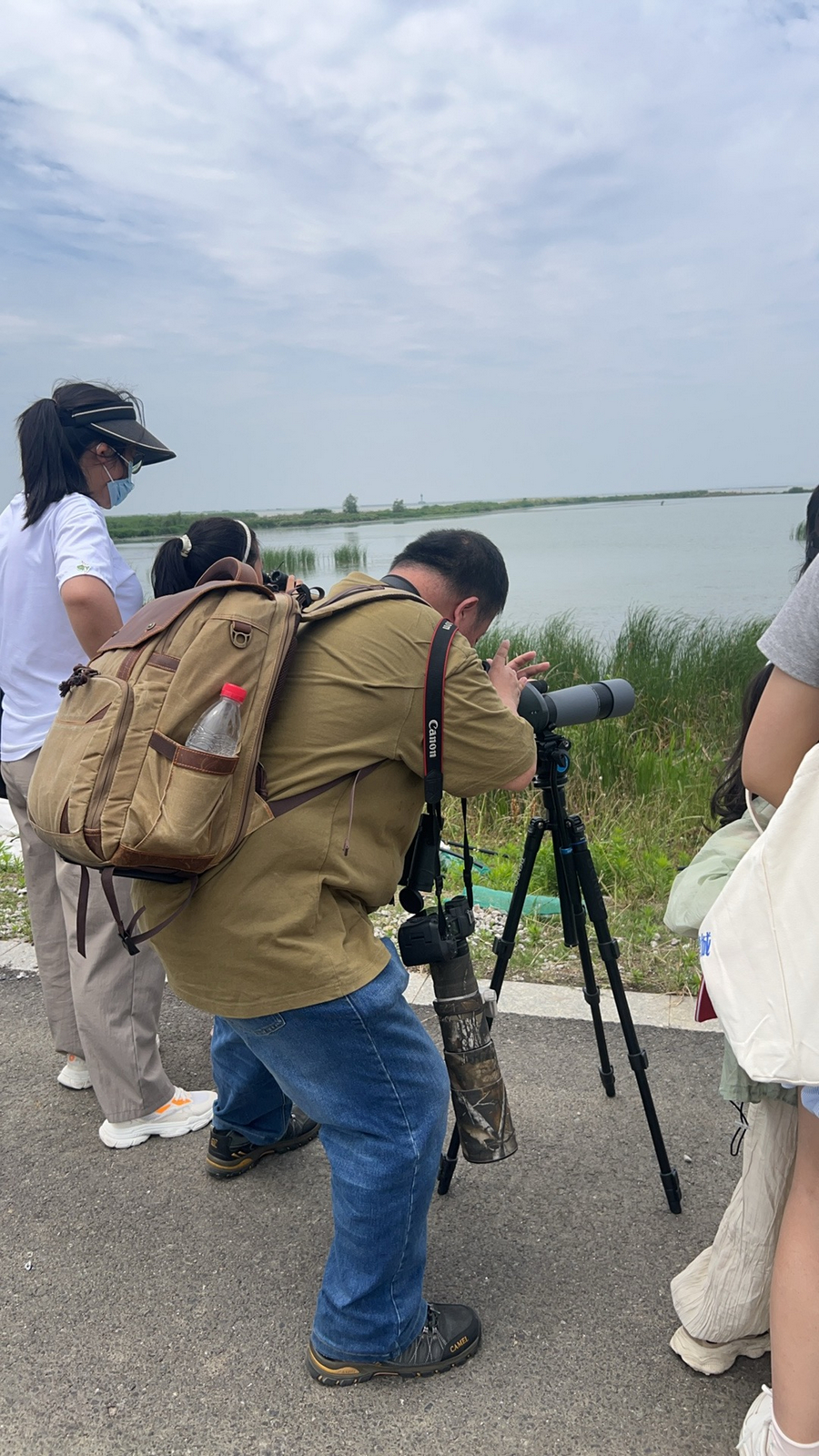 上午9时许,近30名武进日报的小记者,在参观滆湖生态观测试验中心的鸟类标本、模型后,来到“水下森林”鸟类观测点。他们手持望远镜,携带手机相机等拍照设备,在我们工作室的三位鸟友心有鱼(网名)、hoshi(网名)、黄杨居士(网名)带领下,用镜头记录滆湖鸟类活动。